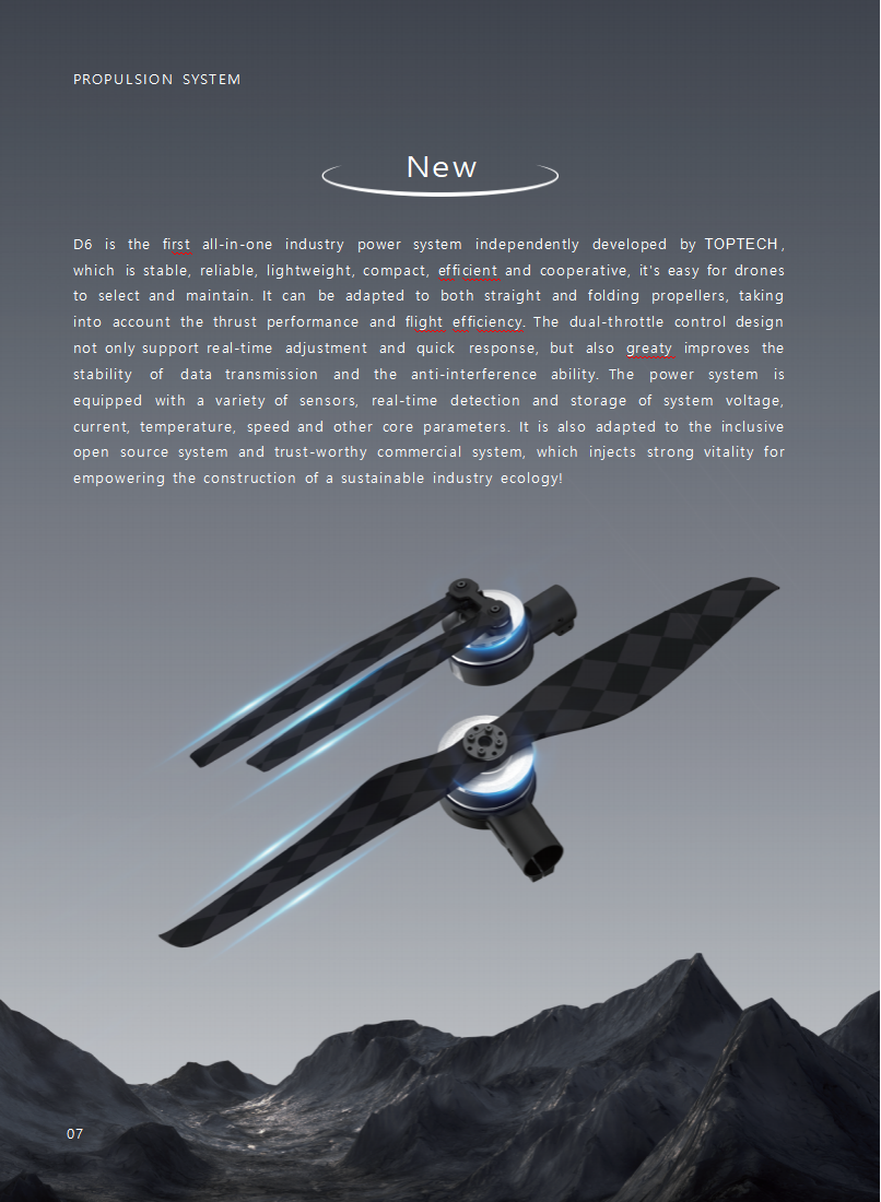 D6  is  the  first  all-in-one  industry  power  system  independently  developed  by TOPTECH , which is stable, reliable, lightweight, compact, efficient and cooperative, it’s easy for drones to select and maintain. It can be adapted to both straight and folding propellers, taking into account the thrust performance and flight efficiency. The dual-throttle control design not only support real-time  adjustment  and  quick  response,  but  also  greaty  improves the stability  of  data  transmission  and  the  anti-interference  ability. The  power  system  is equipped with a variety of sensors, real-time detection and storage of system voltage, current, temperature, speed and other core parameters. It is also adapted to the inclusive open source system and trust-worthy commercial system, which injects strong vitality for empowering the construction of a sustainable industry ecology!